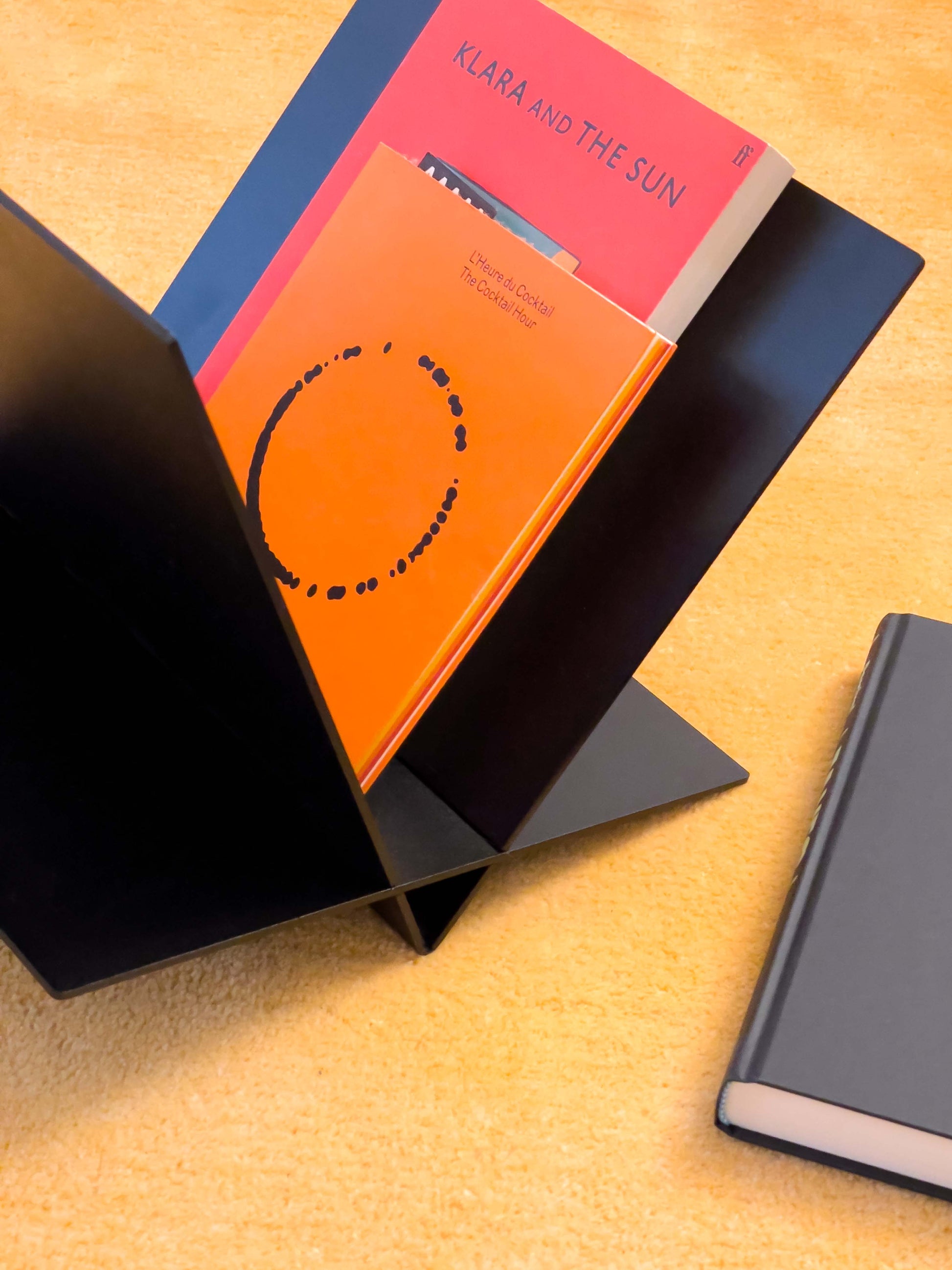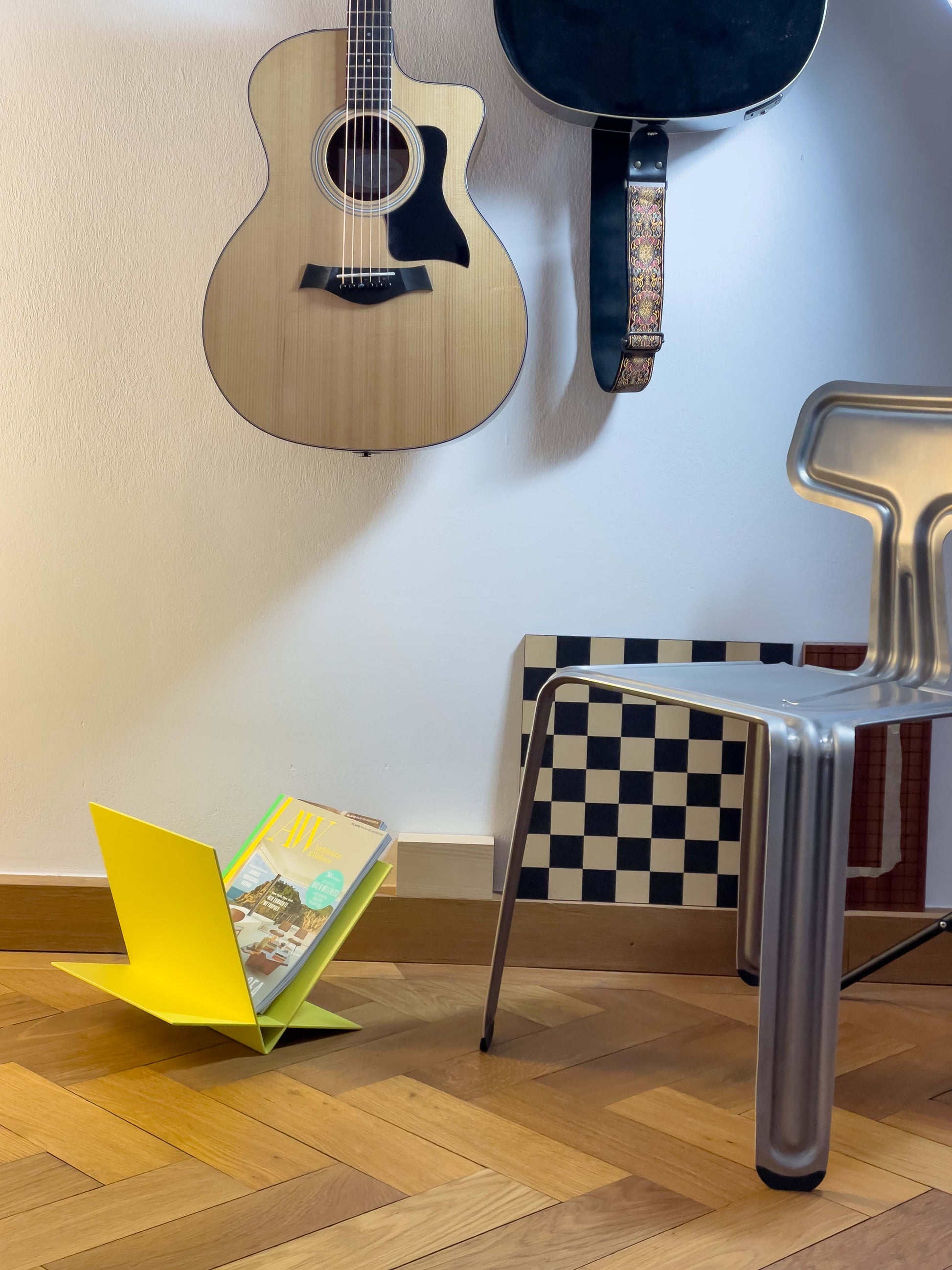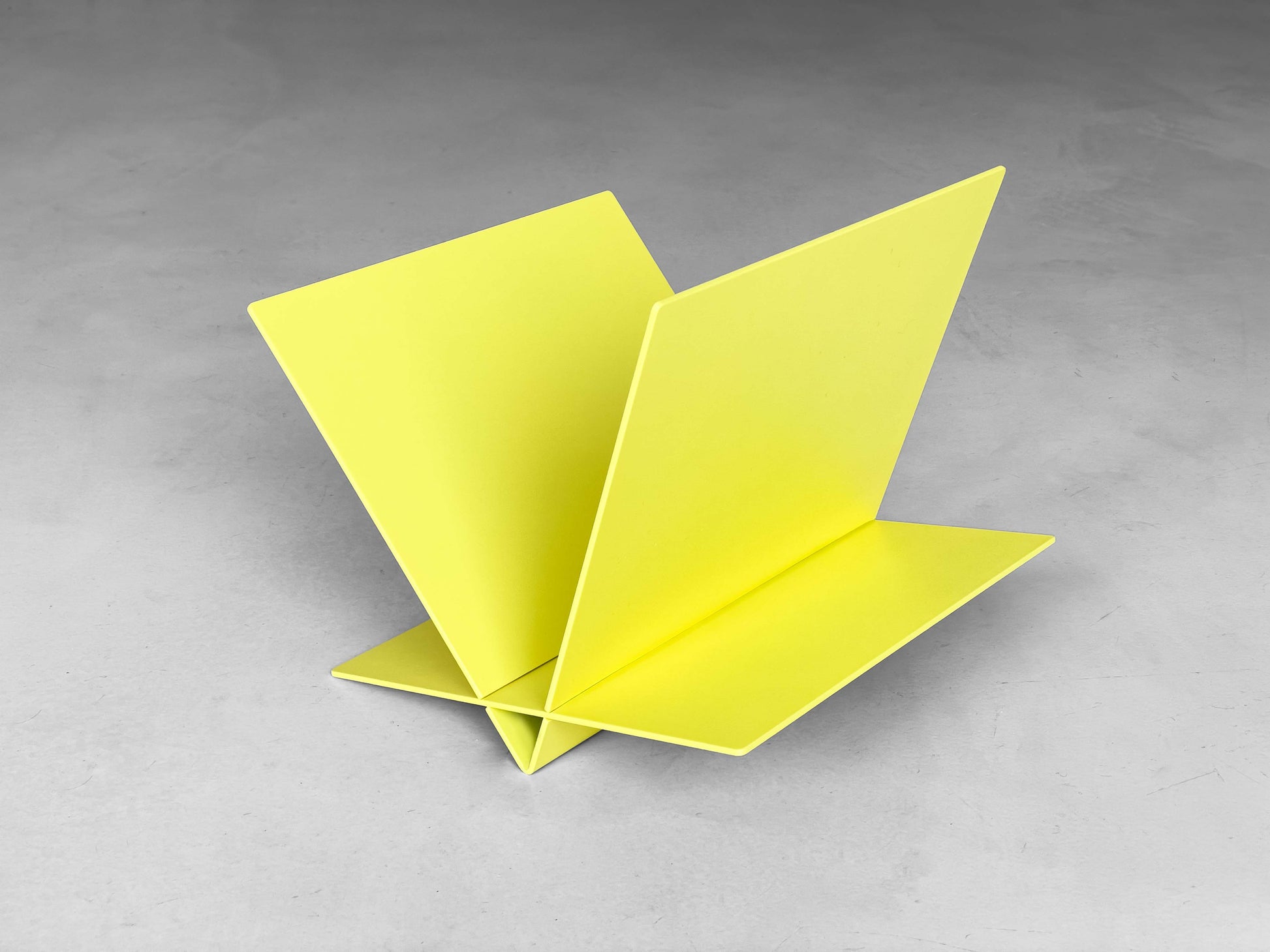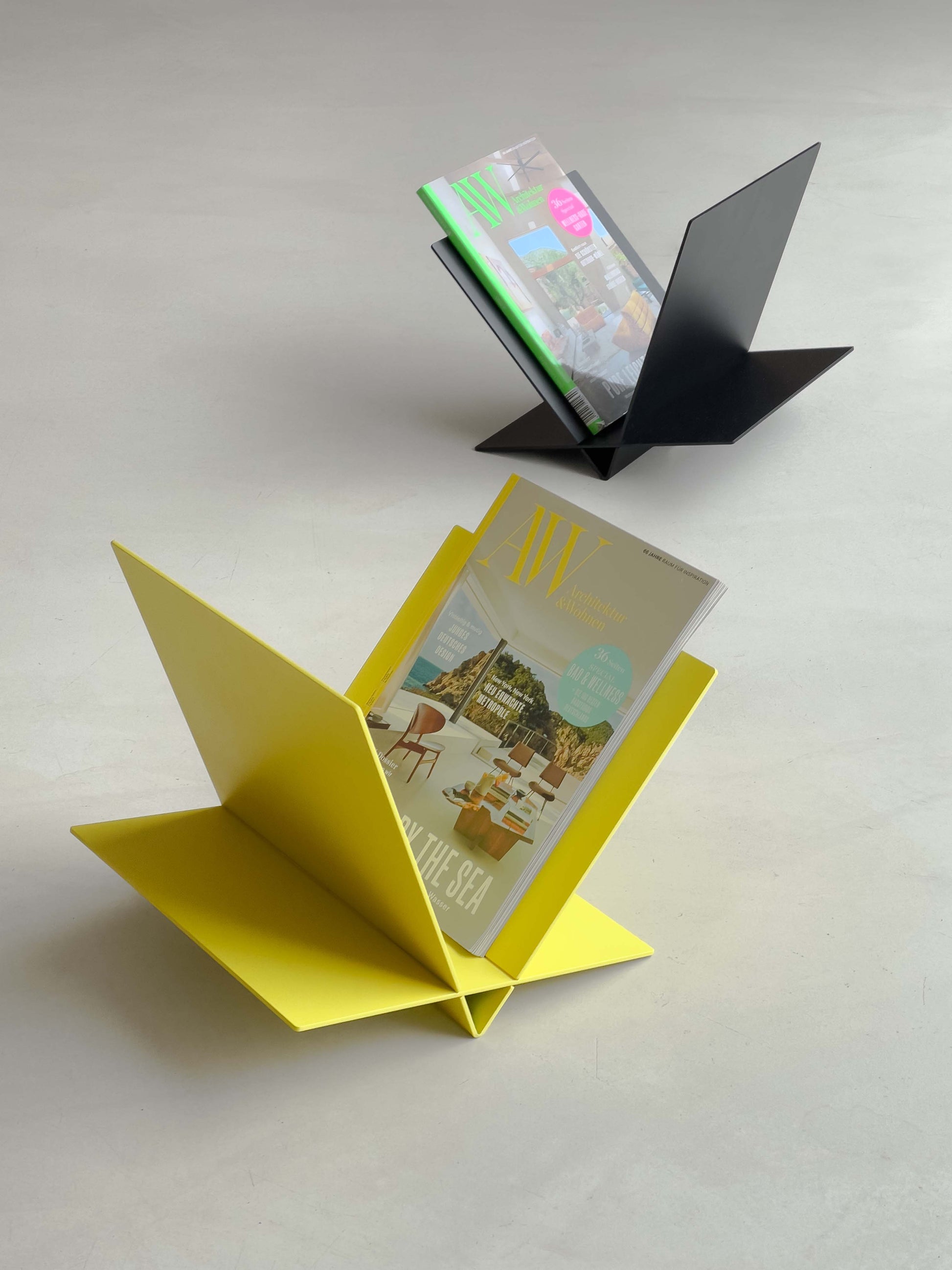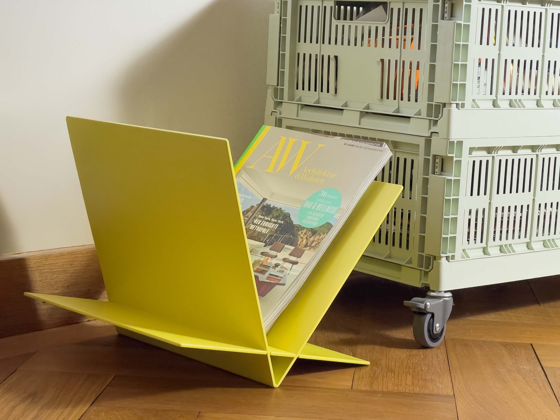 Wackelkandidat ist ein zeitgenössischer, kinetischer Zeitschriftenständer aus gefalteten, pulverbeschichtetem Aluminiumblechen mit einer klaren, ausdrucksstarken Formensprache, die diesem Möbelstück eine skulpturale Ästhetik verleiht und ein Statement im Wohnraum schafft.